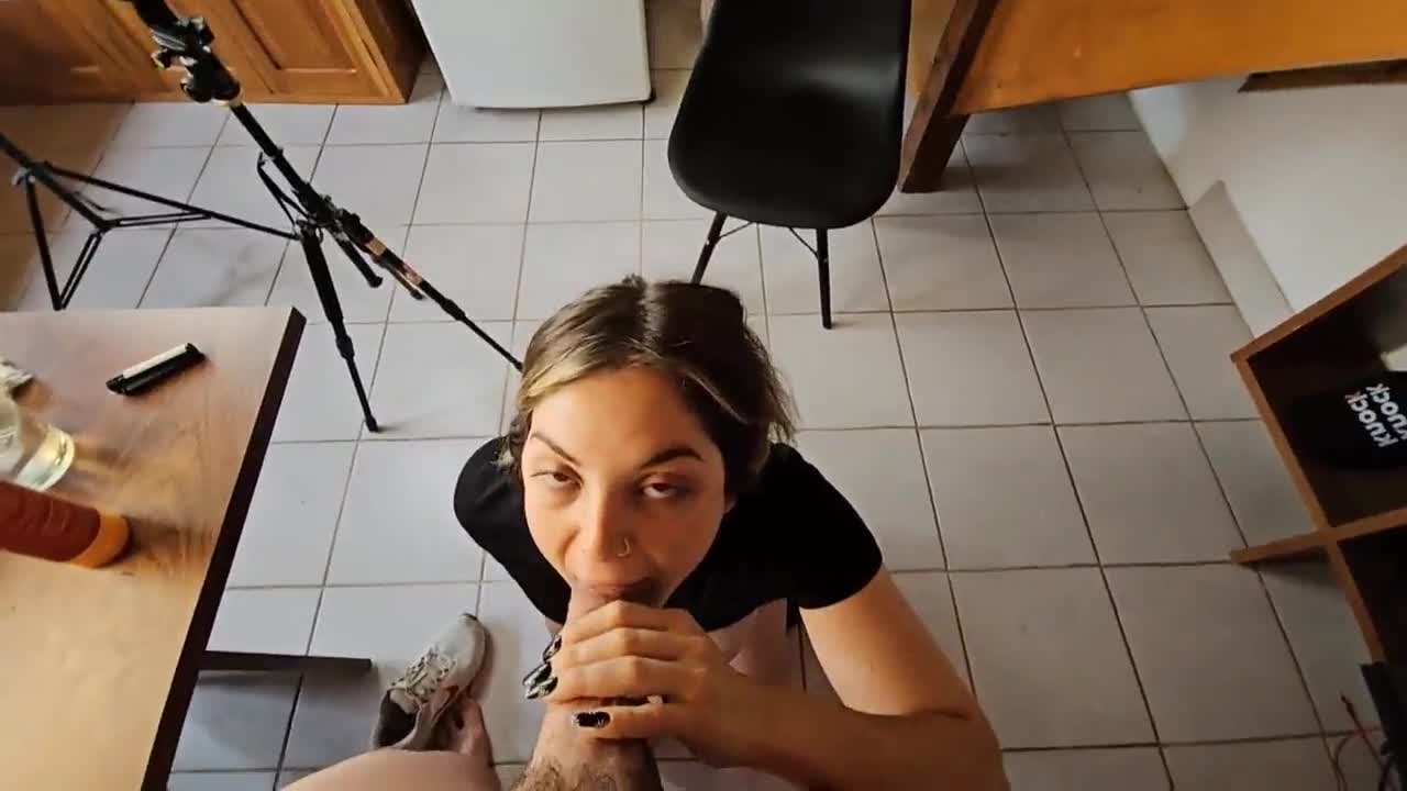 Stepsister visits and gets cum in mouth in kitchen